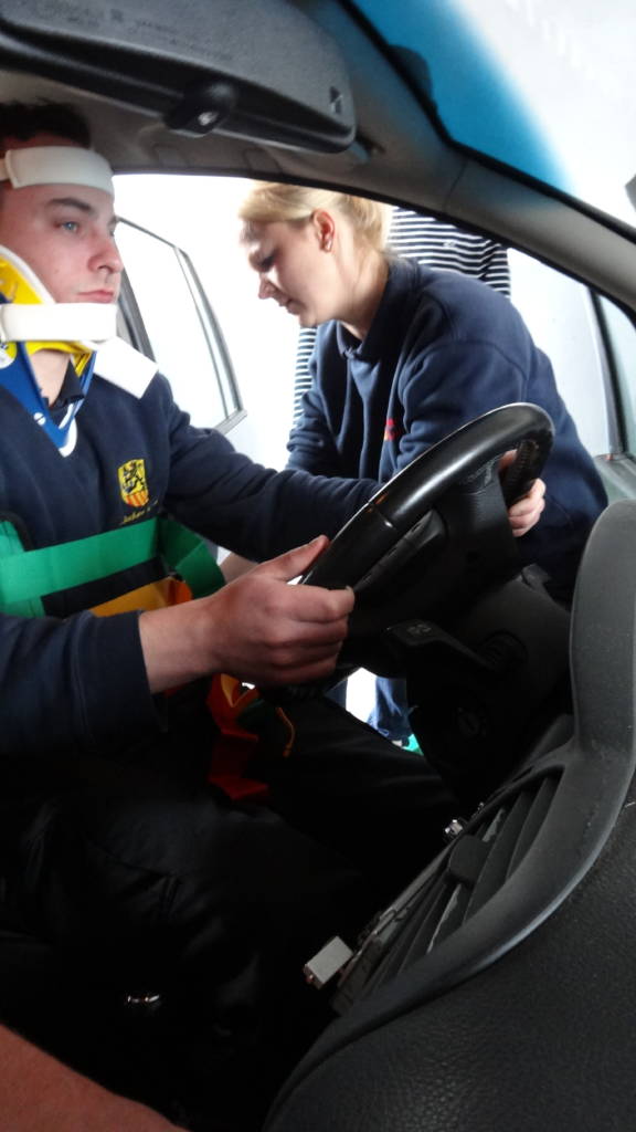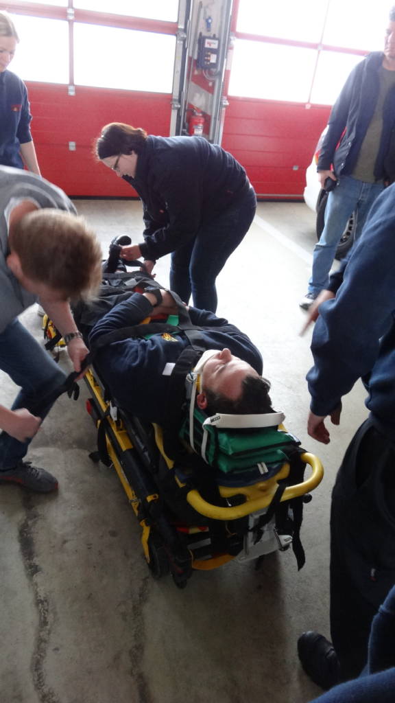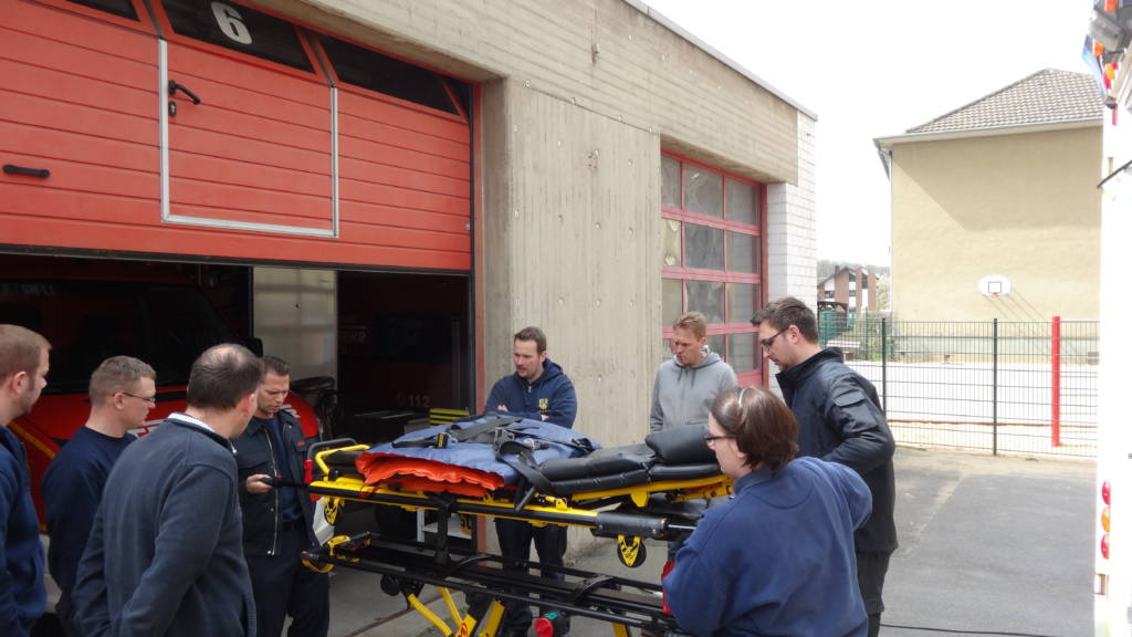 Neben rechtlichen Aspekten stand besonders der Umgang mit medizinischen Gerätschaften und die Zusammenarbeit mit dem Rettungsdienst im Fokus der Fortbildung. Mit dem sog. „KED-System“ wurde eine Person schonend aus einem PKW befreit und anschließend mittels Vakuummatratze auf der Fahrtrage des Rettungswagens immobilisiert.