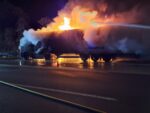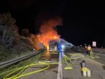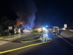 Bereits beim Eintreffen der ersten Einsatzkräfte an der Einsatzstelle standen die Zugmaschine sowie der mit Elektrogeräten beladene Sattelauflieger im Vollbrand. Durch die Feuerwehr wurde die Autobahn komplett für den Verkehr gesperrt und umgehend eine massive Brandbekämpfung an der Zugmaschine sowie am Sattelauflieger durch mehrere Trupps unter Atemschutz eingeleitet. Weiterhin erfolgte zur abschließenden Brandbekämpfung noch der Einsatz von Löschschaum.