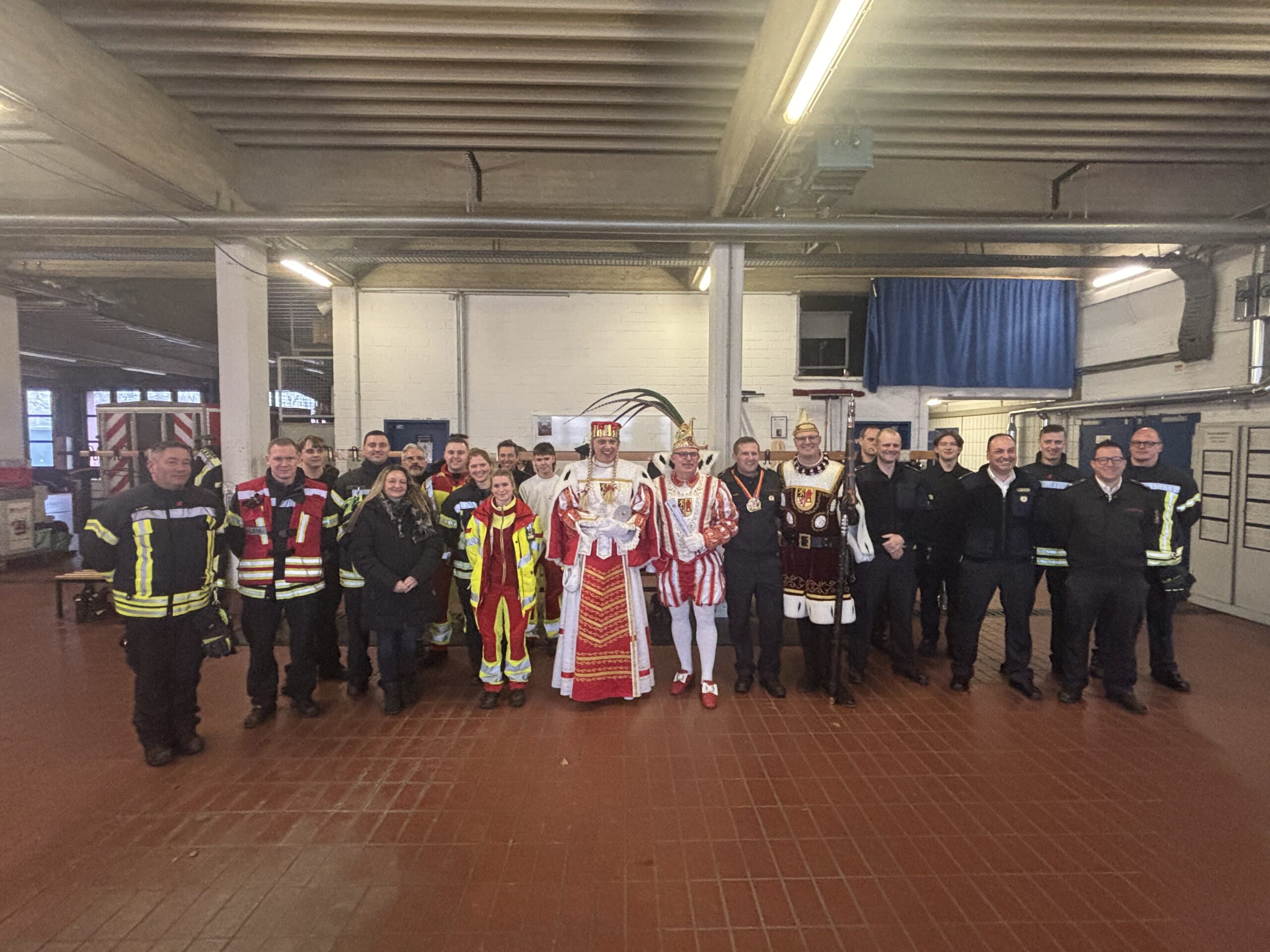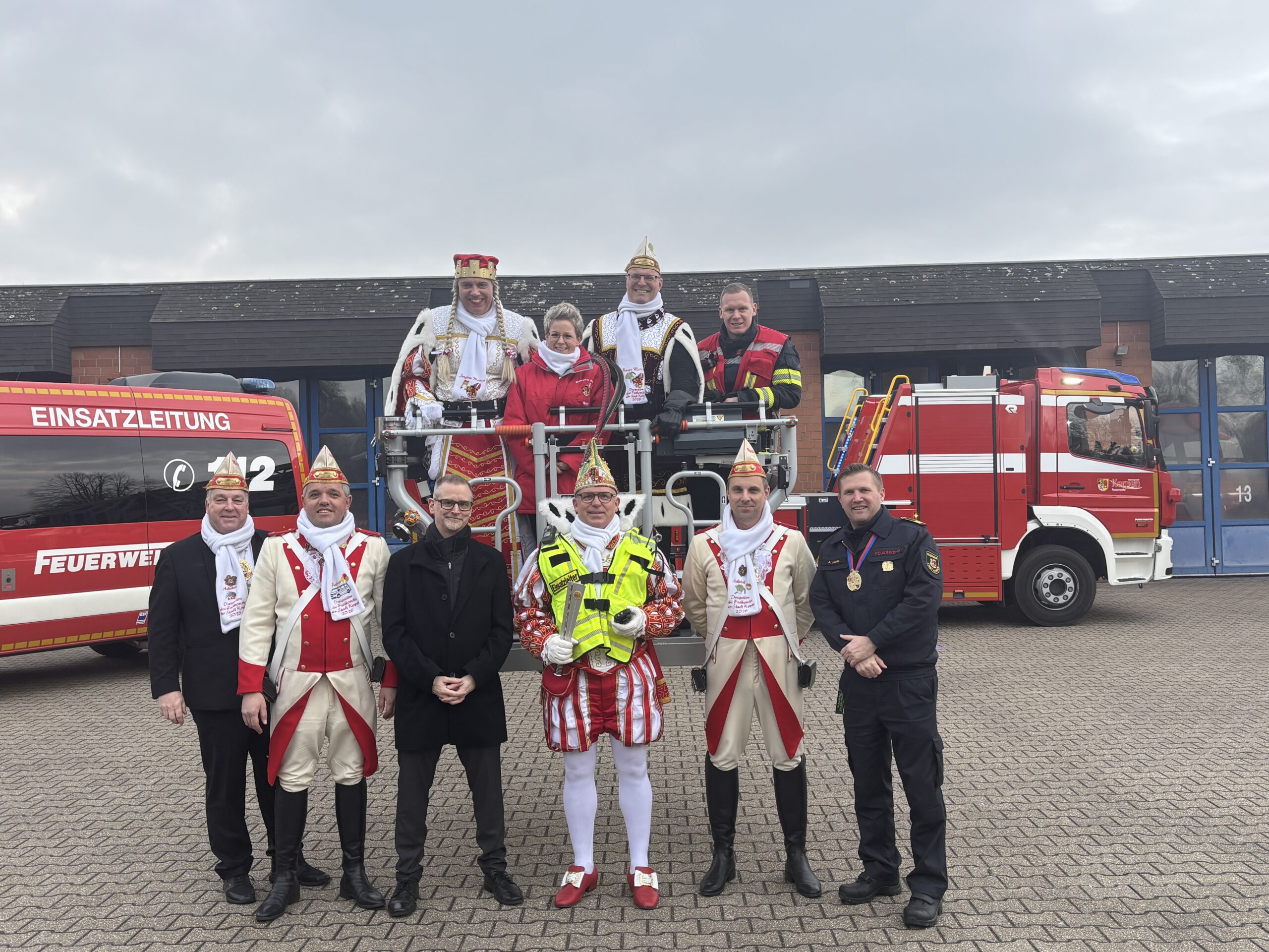 Närrischer Besuch auf der Feuer- und Rettungswache Kerpen: Gestern Nachmittag schaute das Dreigestirn der Stadt Kerpen bei der Feuerwehr vorbei. Zusammen mit dem Ersten Beigeordneten, Thomas Marner, begrüßte der Leiter der Feuerwehr, Branddirektor André Haupts, gemeinsam mit den Kolleginnen und Kollegen der diensthabenden Wachabteilung sowie Mitarbeitenden aus der Verwaltung das Trifolium sowie die Adjutantinnen und Adjutanten.