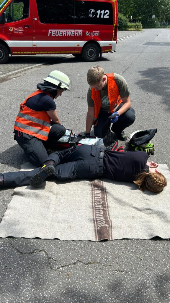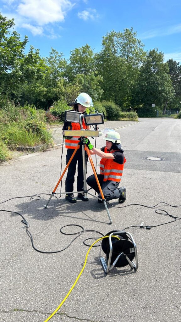 Den Abschluss bildete der erste Prüfungsteil des Grundlehrganges: Eine schriftliche Fragenarbeit mit 25 Fragen galt es zu beantworten. Im Anschluss folgte eine praktische Prüfung, welche die Teilnehmer*innen truppweise – also zu zweit – absolvierten. Per Losverfahren wurden jedem Trupp zwei praktische Übungen, wie bspw. Aufbau einer Einsatzstellenbeleuchtung oder Erste-Hilfe-Maßnahmen bei bewusstlosen Personen, zugelost.