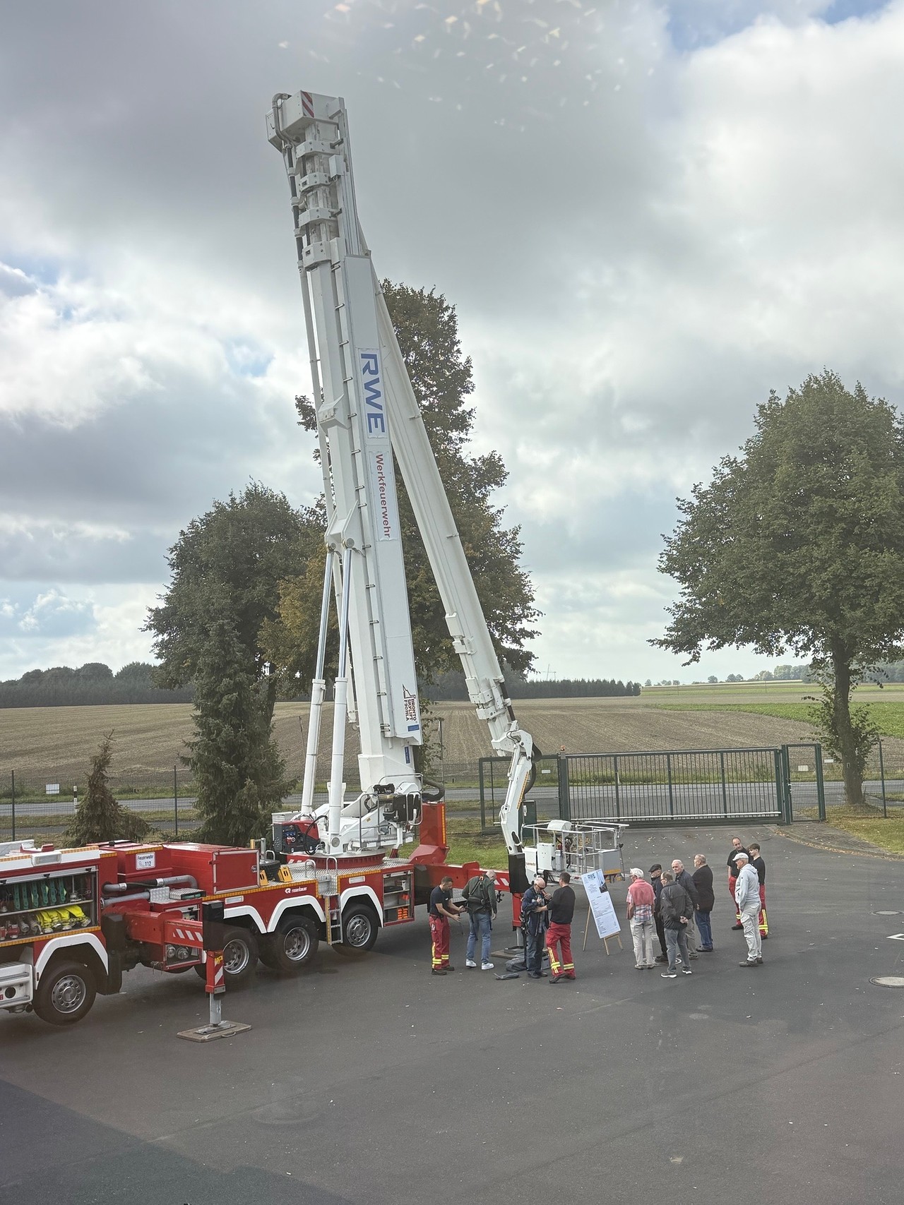 Das Ziel in diesem Jahr war die Werkfeuerwehr der RWE Power. Dort erhielten wir spannende Einblicke in die Arbeit einer Werkfeuerwehr: von der integrierten Leitstelle über die Fahrzeughalle bis hin zur beeindruckenden Teleskopmastbühne mit 90 Metern Rettungshöhe – ein echtes Highlight, das sogar aus luftiger Höhe erlebt werden konnte.