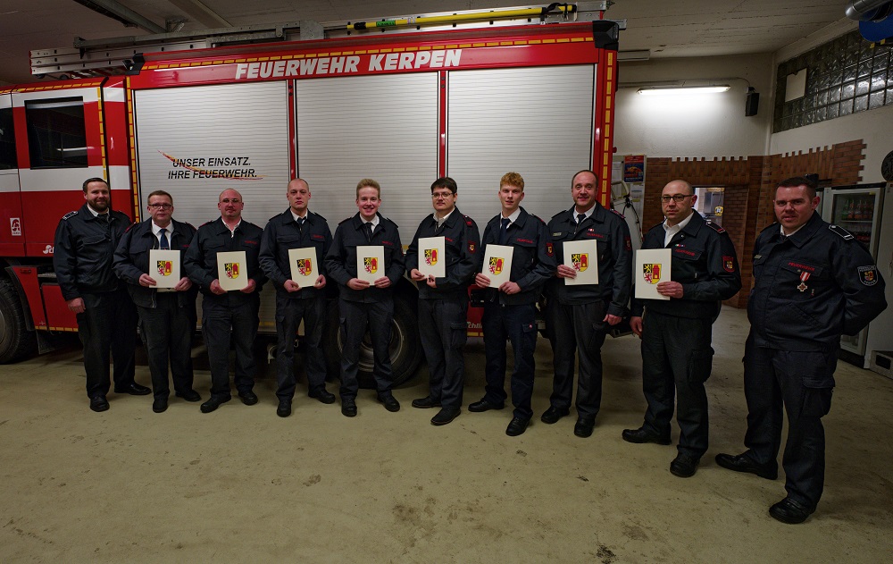Natürlich standen auch Beförderungen auf der Tagesordnung. Tim Burk, Mario Franken, Silas Panke und Marc Peters wurden zum Oberfeuerwehrmann befördert. Philipp Ohm und Marco Schumacher erhielten den Dienstgrad Unterbrandmeister. André Adler wurde zum Brandmeister ernannt, René Altendorf zum Oberbrandmeister.