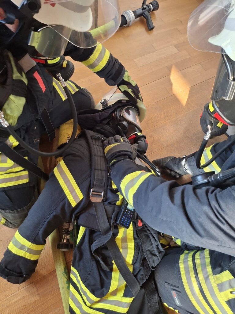 Geübt wurde, wie verunfallte Atemschutzgeräteträger schnell mit frischer Luft versorgt und anschließend sicher aus dem Gefahrenbereich gerettet werden können. Unter Nullsicht und mit voller Schutzausrüstung mussten die Teilnehmerinnen und Teilnehmer im Team arbeiten, Hindernisse überwinden und durch klare Kommunikation sicher ans Ziel kommen – genau wie im Ernstfall.