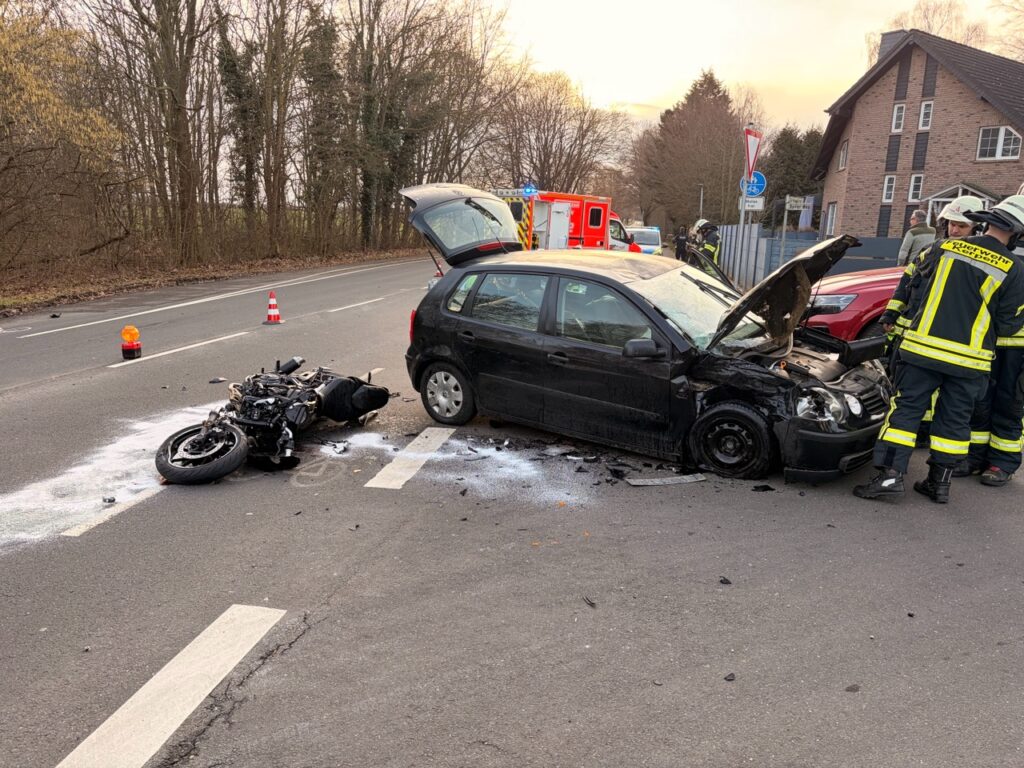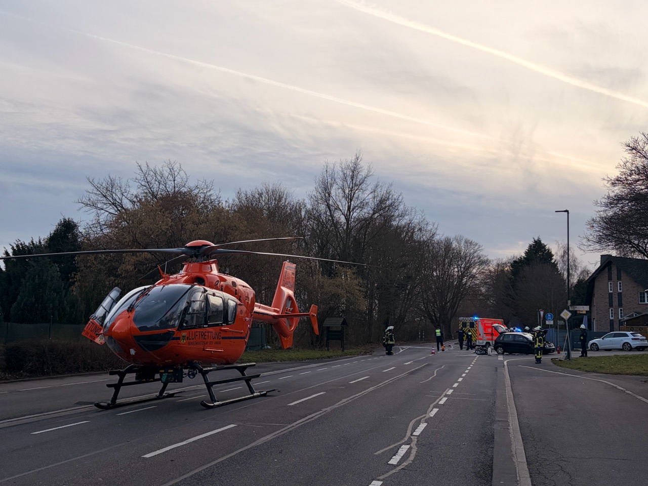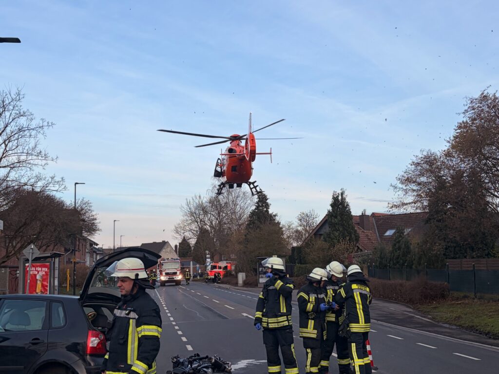 An der Kreuzung Dürener Straße/Buirer Weg kam es aus bislang ungeklärter Ursache zu einem Zusammenstoß zwischen einem Motorrad und einem Pkw. Durch die Wucht des Aufpralls wurde der Motorradfahrer etwa zehn Meter über das Fahrzeug geschleudert. Die zuerst eingetroffene Besatzung des Rettungswagens leitete umgehend die medizinische Versorgung ein. Aufgrund der schweren Verletzungen wurde der Motorradfahrer mit einem Rettungshubschrauber in eine Klinik der Maximalversorgung transportiert.