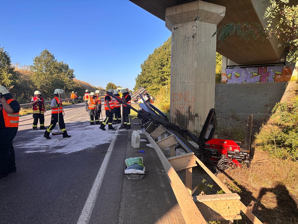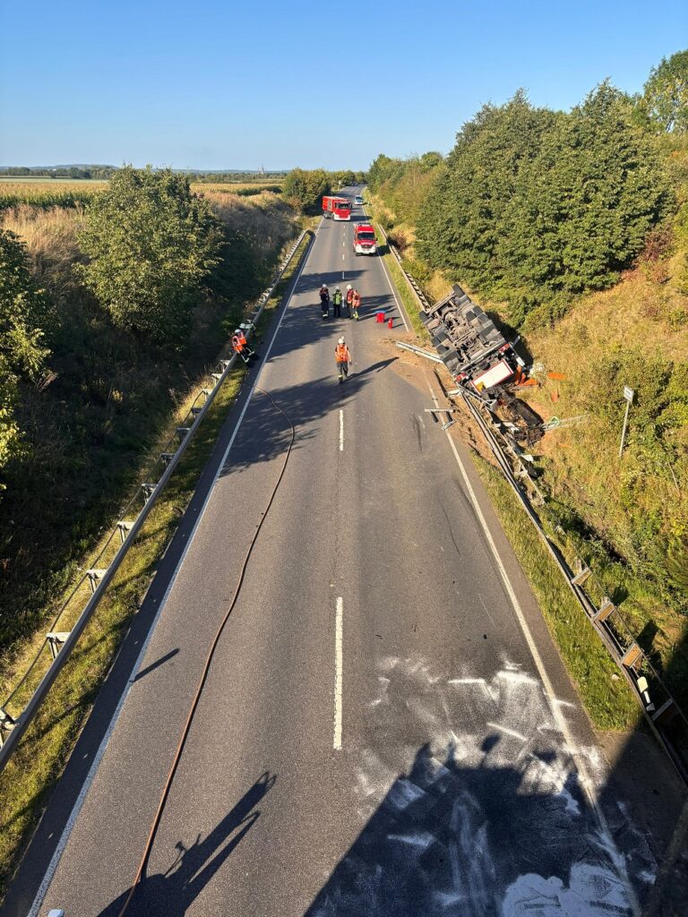 Der LKW-Fahrer wurde verletzt und durch den Rettungsdienst in ein umliegendes Krankenhaus transportiert. Der Brandschutz wurde sichergestellt, sowie ausgelaufene Betriebsstoffe durch die Feuerwehr mit Bindemitteln abgestreut.