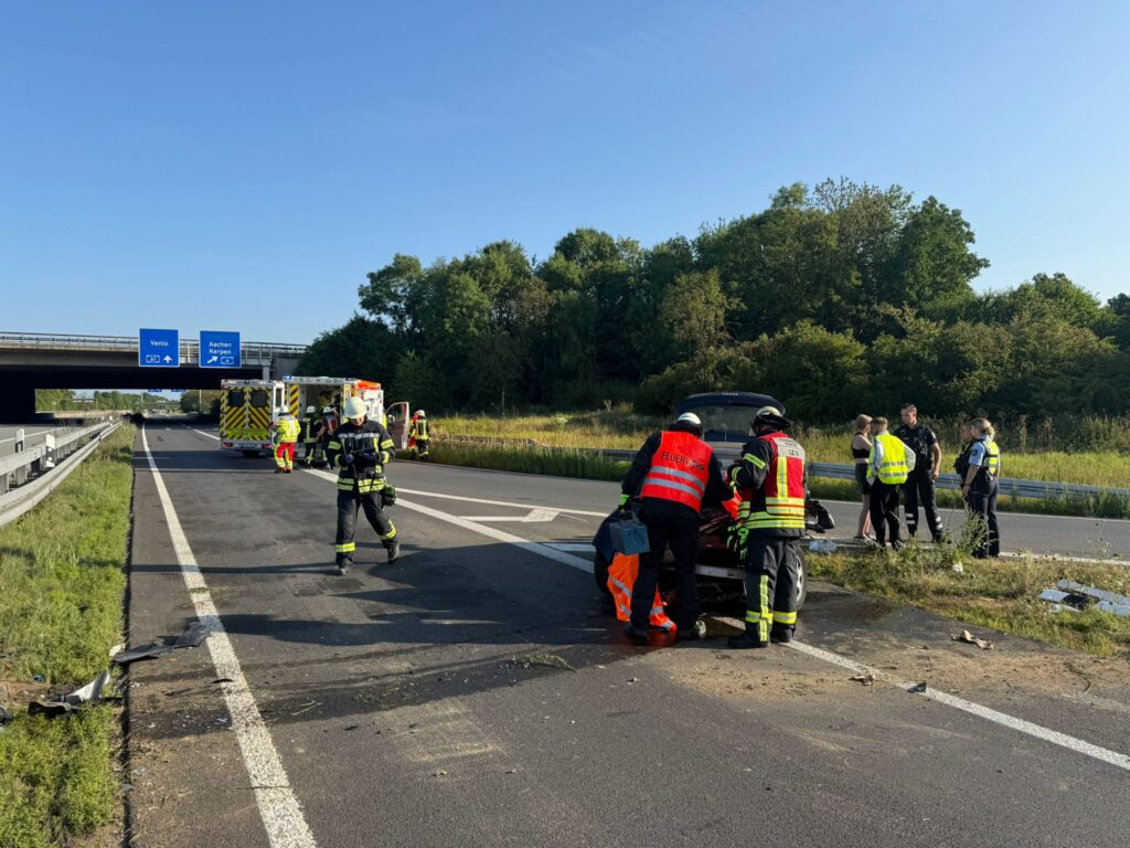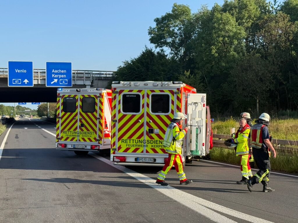 Am heutigen Morgen kam es auf der Autobahn 61 im Kreuz Kerpen zu einem schweren Verkehrsunfall mit mehreren Verletzten. Ein voll besetzter PKW kam aus bisher ungeklärter Ursache in einer Tangente im Autobahnkreuz von der Fahrbahn ab und prallte frontal in die Leitplanke.