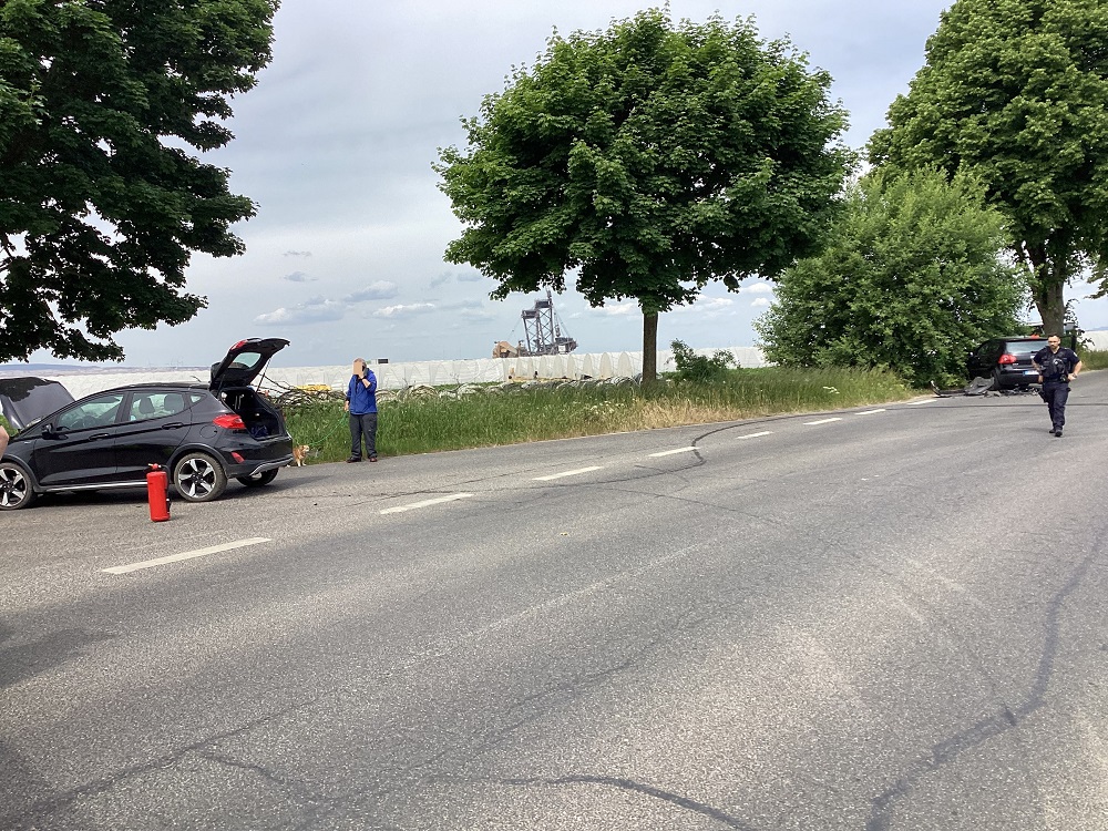 Am heutigen Mittag kam es im Kreuzungsbereich der Kreisstraße 53 und der Straße „Bergheimer Weg“ in der Ortslage Manheim-alt zu einem Zusammenstoß zwischen zwei Fahrzeugen mit drei beteiligten Personen.